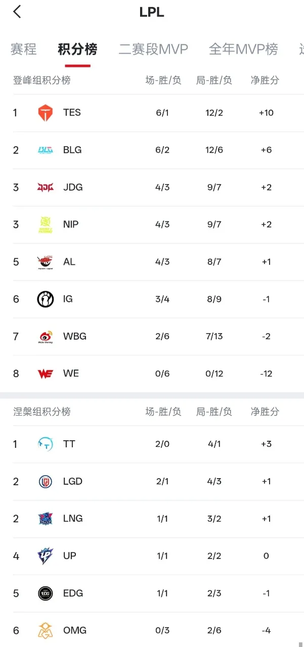 (各位JRs亦可参照文末指引,前往虎扑英雄联盟赛事页查看实时更新的完整LPL战队排名)
